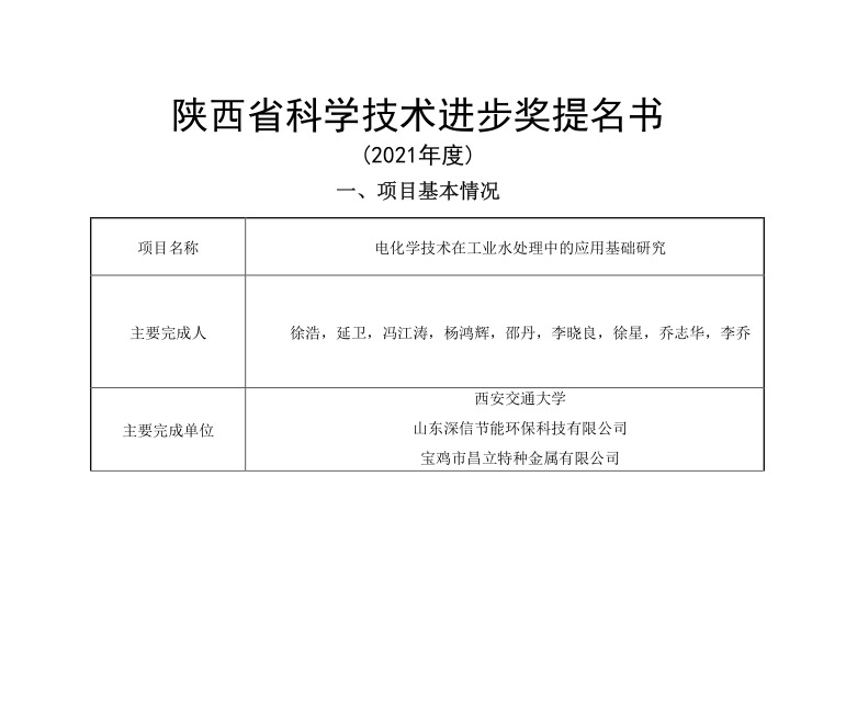 根據陜西省科技獎勵有關要求,現將我司2020年度陜西省科技獎合作申報項目 “電化學技術在工業水處理中的應用基礎研究”信息在公司主頁(http://www.imrf.cn/)上公布,向全校征詢異議。